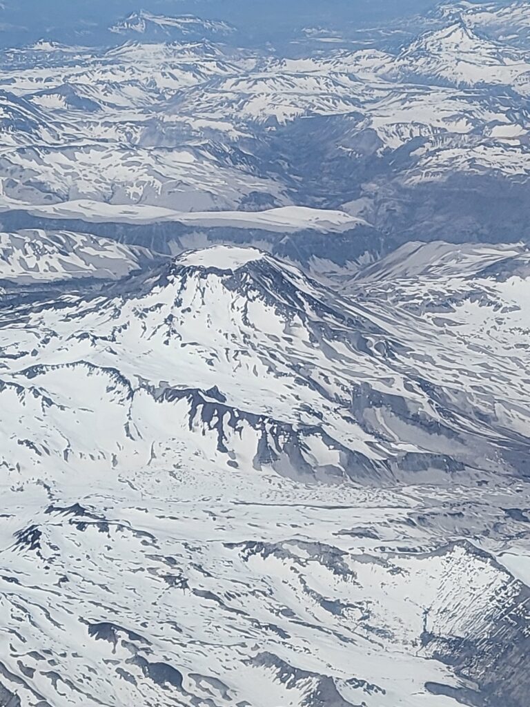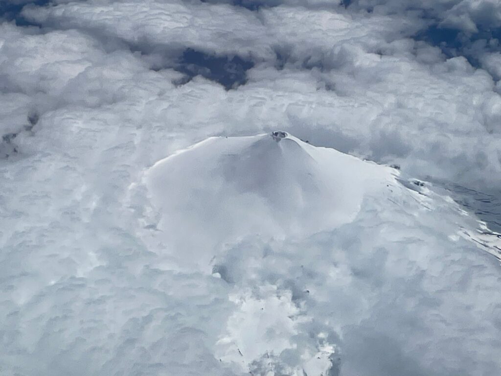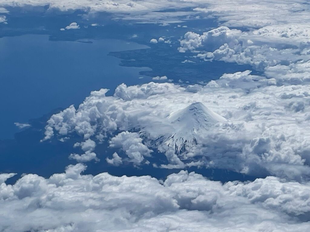Flug über die Anden Kette mit ihren aus den Wolken ragenden Vulkanen. Die Vulkane Osorno und Villarica kennt Michel bestens. Zuerst bestiegen und dann mit den Skiern heruntergefahren.